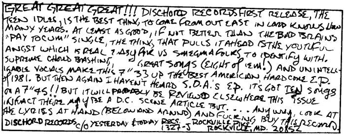 Teen Idles / Sneakers / Get Up and Go / Deadhead // Fleeting Fury / Fiorucci Nightmare / Getting in my Way / Too Young to Rock (Minor Disturbance) 1000 copies on black vinyl w/insert and shiny sleeve 1000 copies on black vinyl w/insert, matte sleeve, second pressing note on back Dischord 1, 1981 Lineup: Nathan Strejcek - vocals / Geordie Grindle - guitar / Ian MacKaye - bass / Jeff Nelson - drums Notes: Both pressings' sleeves are pictured (the brown stuff on the back of the second press is the rubber cement they glued the sleeves with). Labels are identical. 100 copies were destroyed by Geordie or Nathan (it says in Dance of Days...), probably from the first press. Insert only with some copies (I've now seen inserts with both pressings)? Minor Disturbance recorded live at the Idles last show and it sounds like crap. Reviews: I should probably have more to say about this record, but I don't. Prototypical DC thrash, and while it's got an edge to it that the Limp Records axis was lacking, it doesn't have much else. Song writing is rudimentary, vocalist isn't terribly engaging, and the band is often lost behind the guitarist. The real standout tracks are Sneakers, which sounds like a lost Minor Threat song, Get Up And Go, which is easily one of the ten best songs to come out of DC, and Too Young To Rock, which is absolutely unlistenable due to the poor live sound. Are there any good sounding versions out there? I've scanned in two contemporary reviews, from Smegma Journal 9 (below), and Touch and Go 13 (right). | ||||||||||